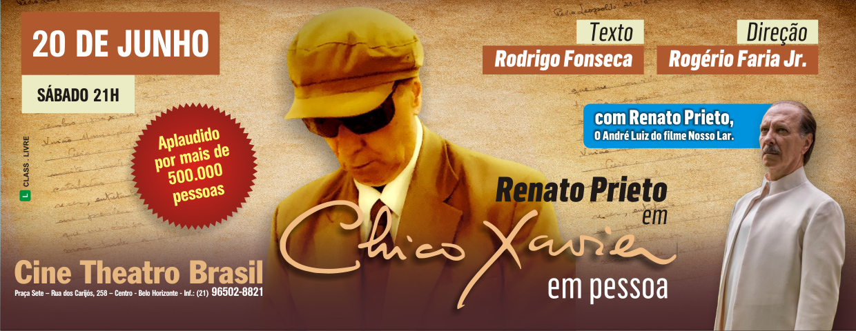 “Chico Xavier em Pessoa” é um solo teatral que retrata, com delicadeza e profundidade, a trajetória, os pensamentos e a missão espiritual de um dos maiores médiuns da história do Brasil. A montagem não é apenas uma biografia — é um encontro íntimo com a essência de Francisco Cândido Xavier, suas dúvidas, sua humildade, sua caridade e sua conexão com o plano espiritual. O espetáculo é estrelado por Renato Prieto, que interpretou o personagem André Luiz no filme Nosso Lar, sucesso absoluto de público no cinema brasileiro. No palco, Renato entrega uma atuação intensa, sensível e espiritualizada, que emociona e transforma plateias por onde passa. Consagrado nacionalmente, o espetáculo já foi aplaudido por mais de 500 mil pessoas em todo o Brasil, consolidando-se como uma das mais importantes montagens teatrais de temática espiritual do país. No palco, o público acompanha reflexões sobre vida, morte, propósito, perdão, amor ao próximo e espiritualidade, em uma narrativa construída com respeito, poesia e profundidade emocional, acessível tanto ao público espírita quanto a qualquer pessoa em busca de sentido, conforto e conexão interior. “Chico Xavier em Pessoa” é mais do que um espetáculo: é uma experiência de luz, consciência, emoção e humanidade.